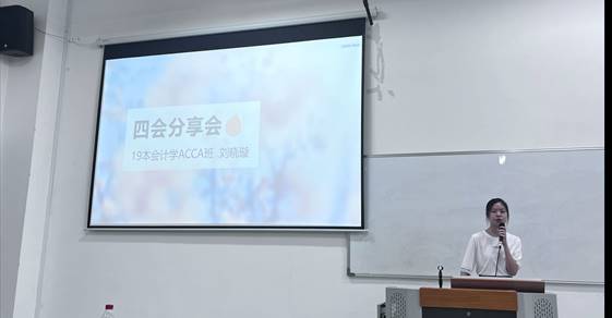 接下来19届ACCA优秀师姐刘晓璇也为新生们进行ACCA考证经验分享。她以过来人的身份分享学习ACCA的心路历程和学习方法,她学习ACCA的内在驱动力在于取得成果后的满足感和喜悦。