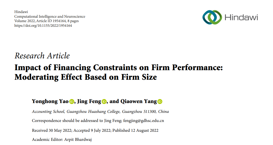 近日,beat365在线体育官网登录入口青年教师姚永红(第一作者)、冯婧(通讯作者)、杨俏文合作发表了题为“Impact of Financing Constraints on Firm Performance:Moderating Effect Based on Firm Size”(企业规模对融资约束和企业绩效的调节效应研究—基于沪深A股上市公司的实证分析)的论文。该论文发表于《Omputational Intelligence and Neuroscience》期刊,该期刊属于SCIE检索期刊,最新影响因子为3.12,是中科院3区期刊。