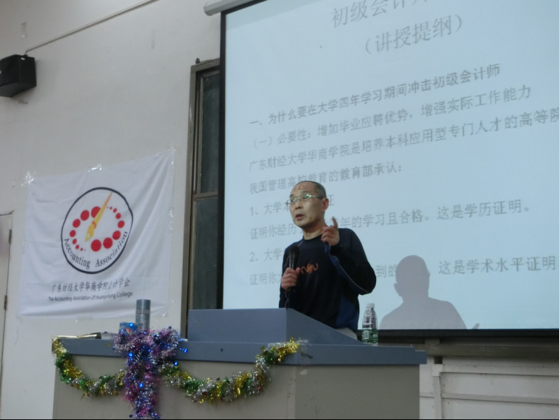 在主持人宣布下,讲座正式开始。陈教授首先为大家讲述了初级会计师职称的必要性,同时解答了为何要考取初级会计师职称的一系列问题,为大家勾勒出考证蓝图。随后,陈教授为在座的同学们详细地介绍了2015年初级会计职称考试的科目、时间和方式,并对考题做出相应预测。诙谐生动的演讲调动起了同学们的积极性,在提问环节,面对同学们的提问,陈教授耐心地为同学们答疑解惑,并对同学们的复习思路、学习计划、考试技巧做出相应指导和建议。