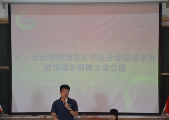 指导老师梁银雄做了最后的总结发言。他首先表达了他对团学成员的感激与不舍之情,其次,他希望团学的每个人今后不论身处何地,都别忘了“团学”这个大家庭。最后从深度、角度和宽度分别分析了团学存在的问题,并对团学未来的工作寄予厚望。希望团学在后来的工作中可以与其他系多加交流并取其精华,使得团学能更好的发展下去。
