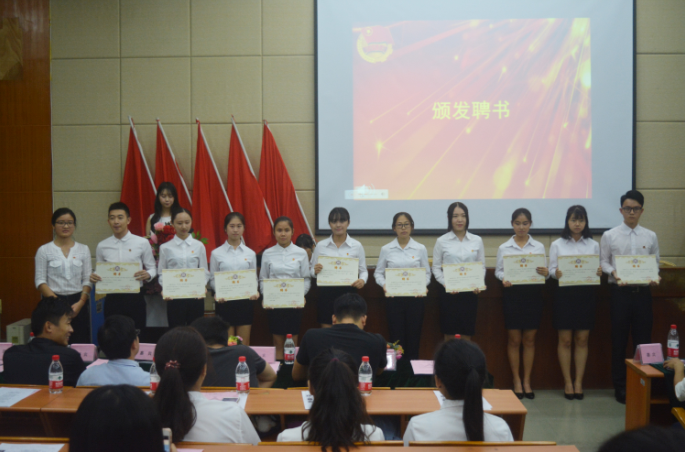 接着,学生会主席代表beat365在线体育官网登录入口第三届团总支学生会向大会作了工作报告。陈洋广老师、陈丽敏老师、梁银雄老师和苏博云老师分别给第三届的常委团、部长、副部长和干事颁发聘书。团总支书记梁银雄表示:聘书是对干部们的肯定,希望下一届干部能够继承上届的优良传统,认真总结,发挥优势,完善自我,开拓思路,求实创新,成就更好的团学。