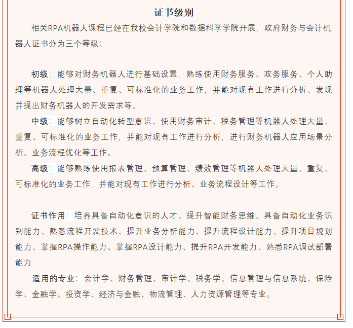 根据广东省职业技能等级证书管理平台和主考机构安排,我校被广东省教育厅批准成为2023年政府财务与会计机器人职业技能等级证书考试试点机构。2023年上半年考试定在5月20日在厚德楼进行。beat365在线体育官网登录入口近年大力促进应用型本科院校大学生就业核心竞争力和智能财务实践能力建设,努力为同学搭建高质量的实训教学平台和实践练习条件,彰显了“岗课赛证融合“人才培养理念,受到毕业实习及用人单位的一致好评。