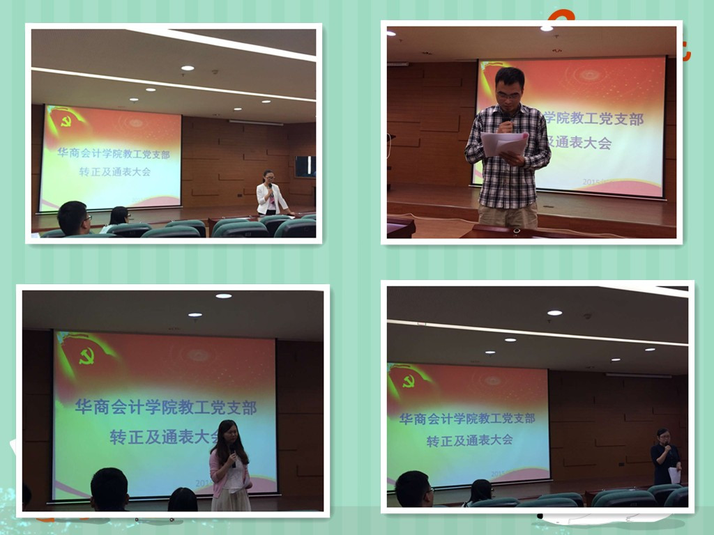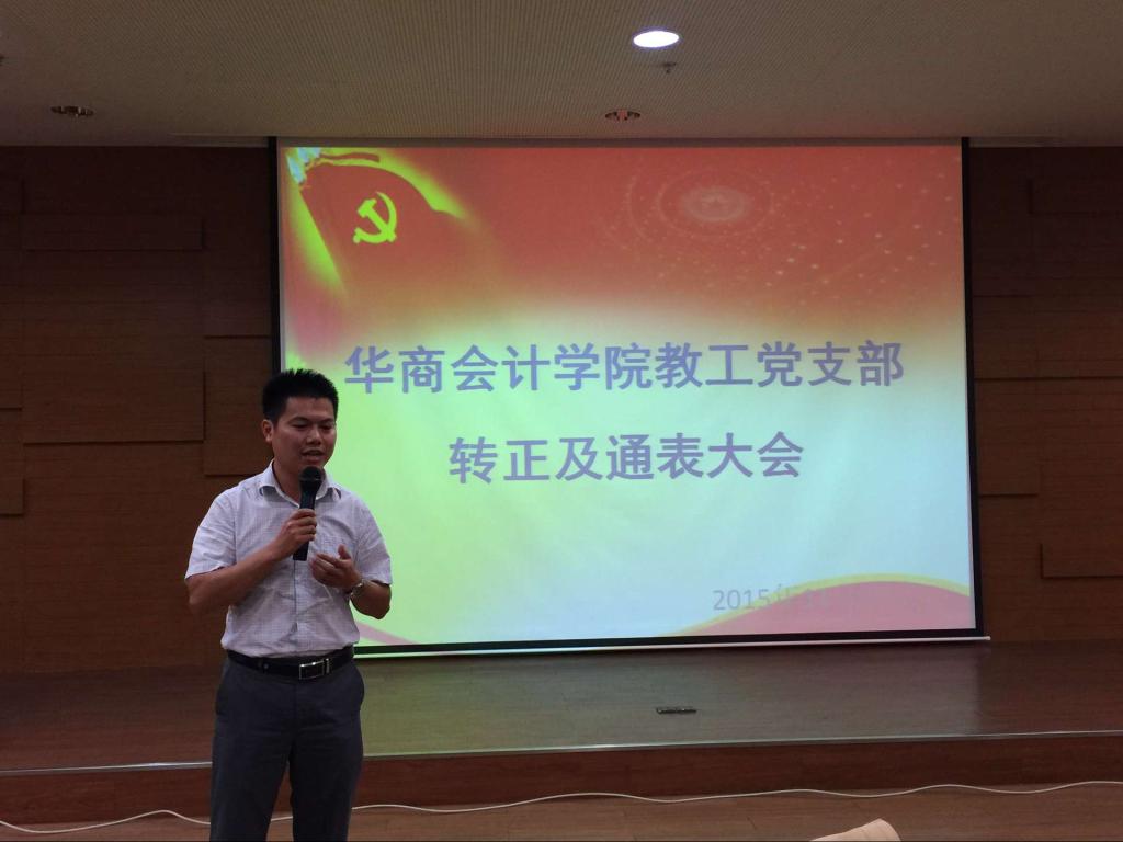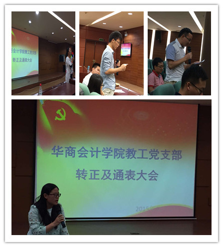 2015年11月17日17:00,华商beat365在线体育官网登录入口教工党支部2015-2016学年第一批通表大会及预备党员转正大会在图书馆一楼报告厅隆重举行,出席本次会议的有华商beat365在线体育官网登录入口党总支许娜副书记、教工党支部王敏书记和全体党员及4位发展对象。