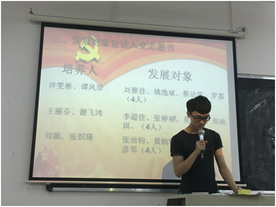 大会第二项及第三项,预备党员宣读转正申请书及发展对象宣读入党志愿书,会议在庄重而不乏活跃的气氛中进行。入党宣讲中各预备党员、发展对象针对自己的个人家庭、成长经历、大学生活、对党的认识的变化等情况向组织作了汇报。内容真切丰富,贴进生活,有较强的感染力。在此环节中,培养人对预备党员、发展对象提出了合理的建议,预备党员、发展对象也深刻反省了自己的不足,如脾气过于急躁、生活作息不规律、体育锻炼过少、与同学交流过少、公共场合表现紧张等,并针对自己的不足提出了改正的方案。并得到了积极的回应。