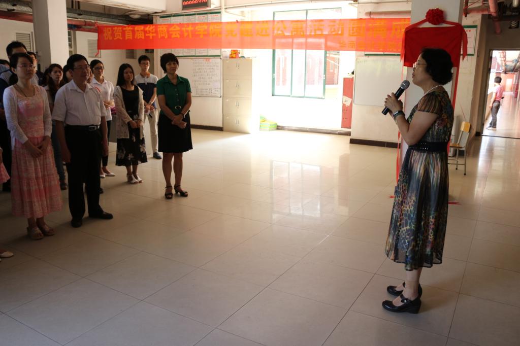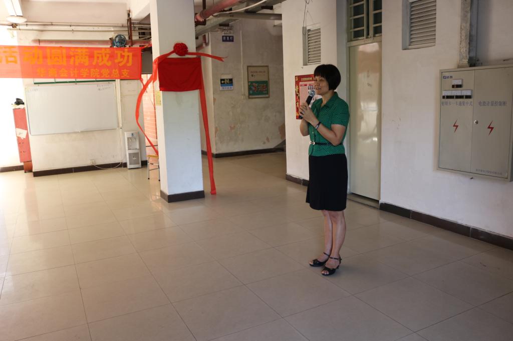揭牌仪式共有三项议程。仪式第一项议程,马玉珍副院长上台致辞。马玉珍副院长非常肯定“党建进公寓”活动。马副院长认为该项党建活动开启了华商beat365在线体育官网登录入口学生党支部党建工作的先河,学生党员进入寝室,可以发挥党员模范作用,传播正能量,团结同学,服务同学,发扬党员精神。在此,马副院长也寄予了两点希望。一:党建工作不要形式,学生党员要发挥战斗堡垒作用,落实党员责任,发挥党员作用,把热爱祖国、热爱党、热爱生活的正能量思想传播予身边同学。二:学生党员要发挥服务意识,辅助寝室管理,促使寝室管理工作有所改变,带动寝室舍友及身边同学营造“好好学习、努力工作”的氛围,树立正确的三观,提高自己和普通同学对党更深层次的认识,培养爱国情怀,树立远大理想,国家繁荣富强需要我们努力。