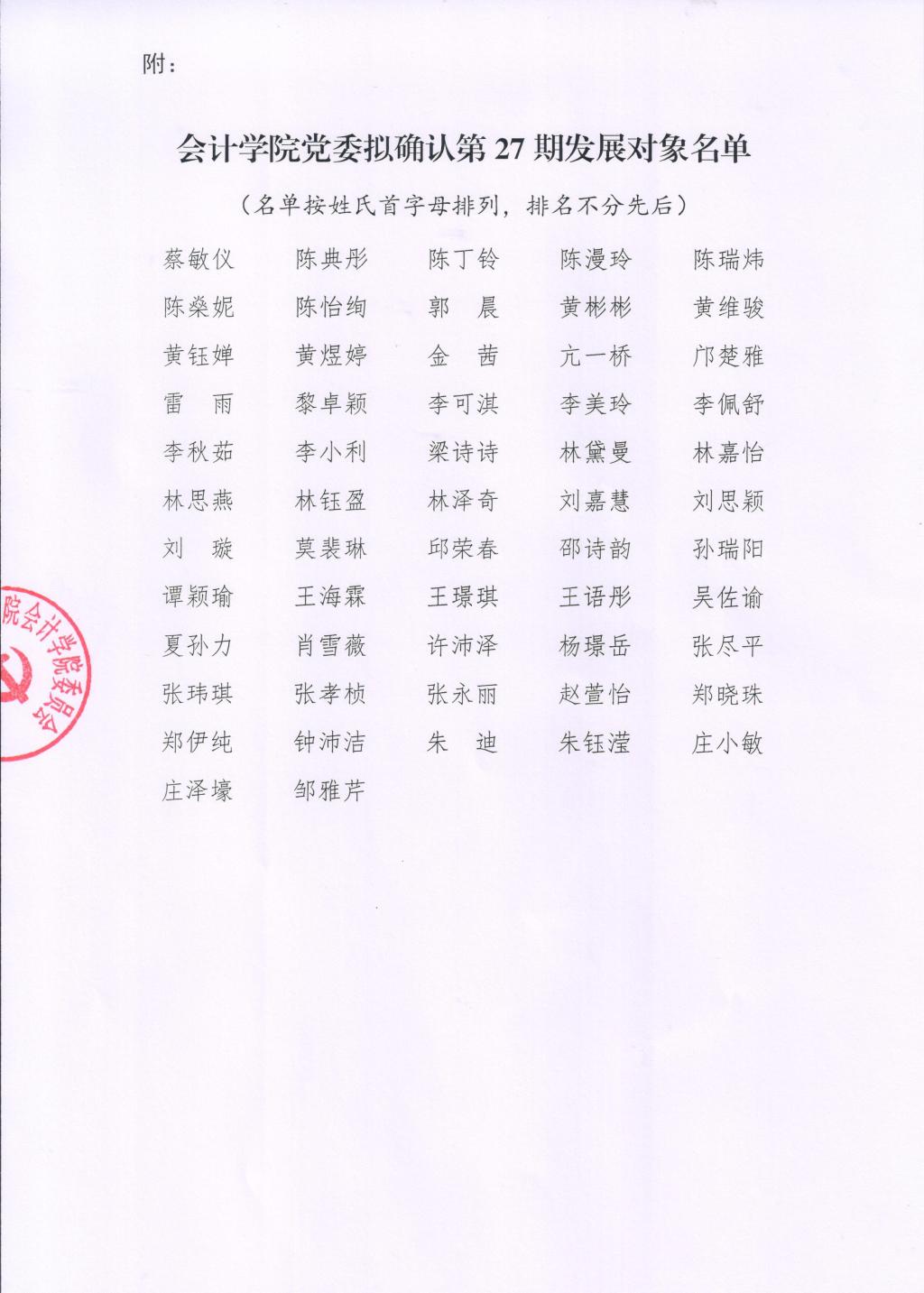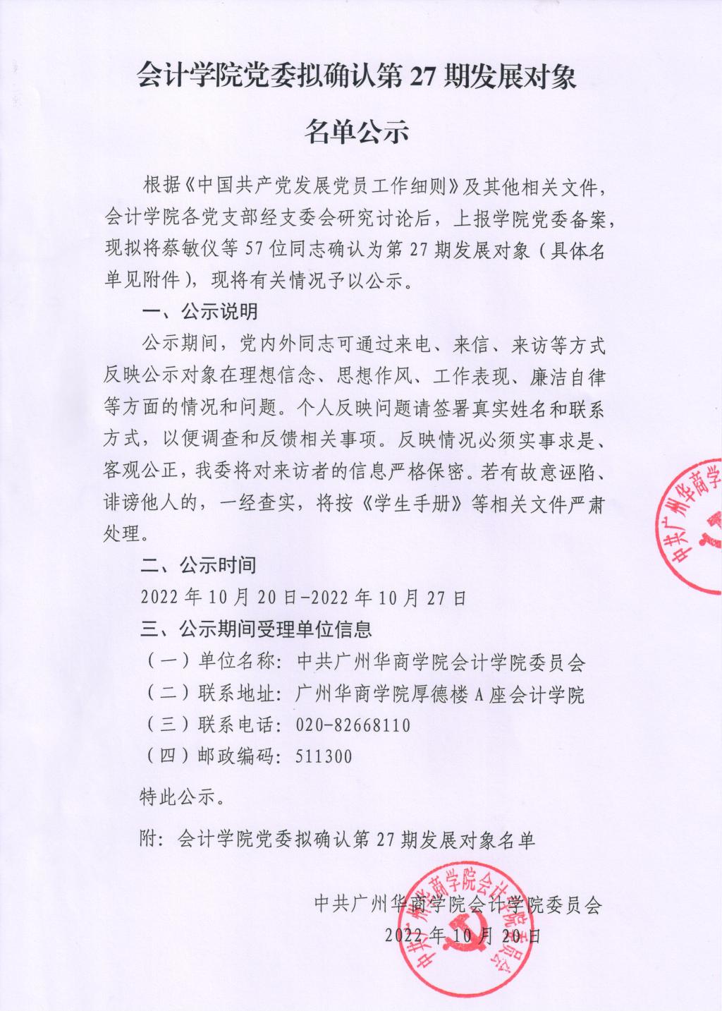 根据《中国共产党发展党员工作细则》及其他相关文件,beat365在线体育官网登录入口各党支部经支委会研究讨论后,上报学院党委备案,现拟将蔡敏仪等57位同志确认为第27期发展对象(具体名单见附件),现将有关情况予以公示。