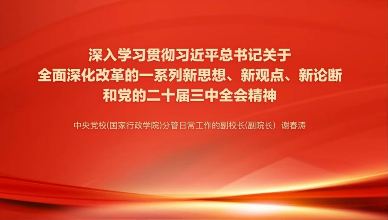 中共中央党校(国家行政学院)分管日常工作的副校长(副院长)谢春涛在讲授中深刻阐述了党的二十届三中全会召开的重大意义,深入剖析了习近平总书记关于全面深化改革的一系列新思想、新观点、新论断,系统解读了进一步全面深化改革的重大原则、重大举措。