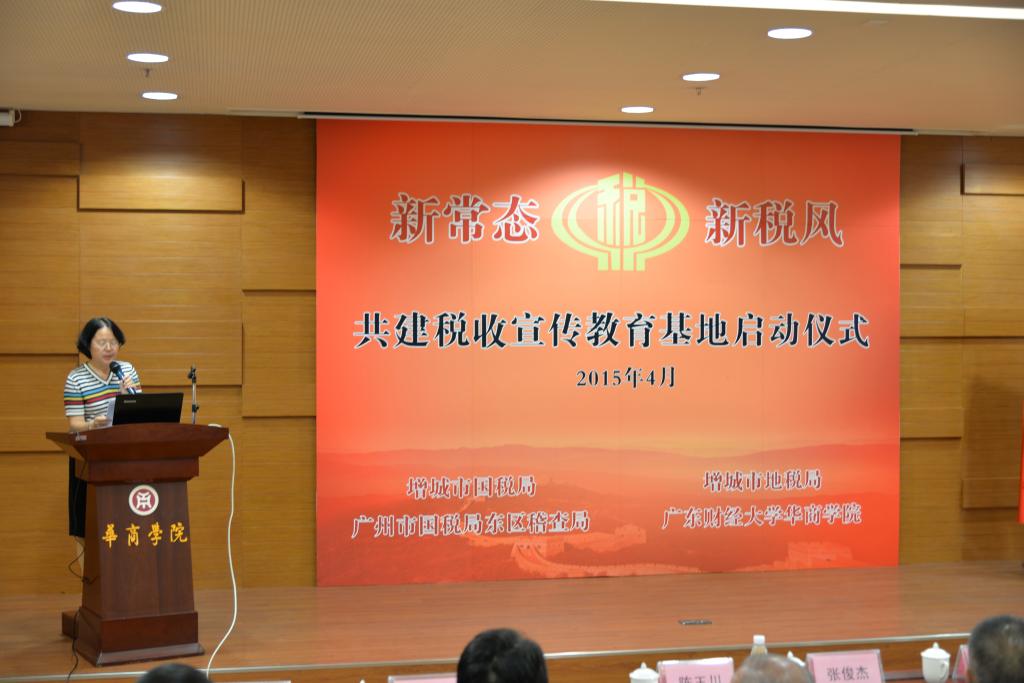 在这浓厚的学习氛围中,启动仪式也慢慢接近尾声。仪式最后,马玉珍院长总结了这两场讲座中所涉及的税务知识,她对于两位局长的生动讲课给予了高度评价。她讲到,今天的讲座为同学们讲解了许多在平时课堂上不能了解到的税务知识,也解决了很多同学们在税务知识学习上的困惑。最后,她预祝广东财经大学华商学院宣传教育基地能取得圆满成功。