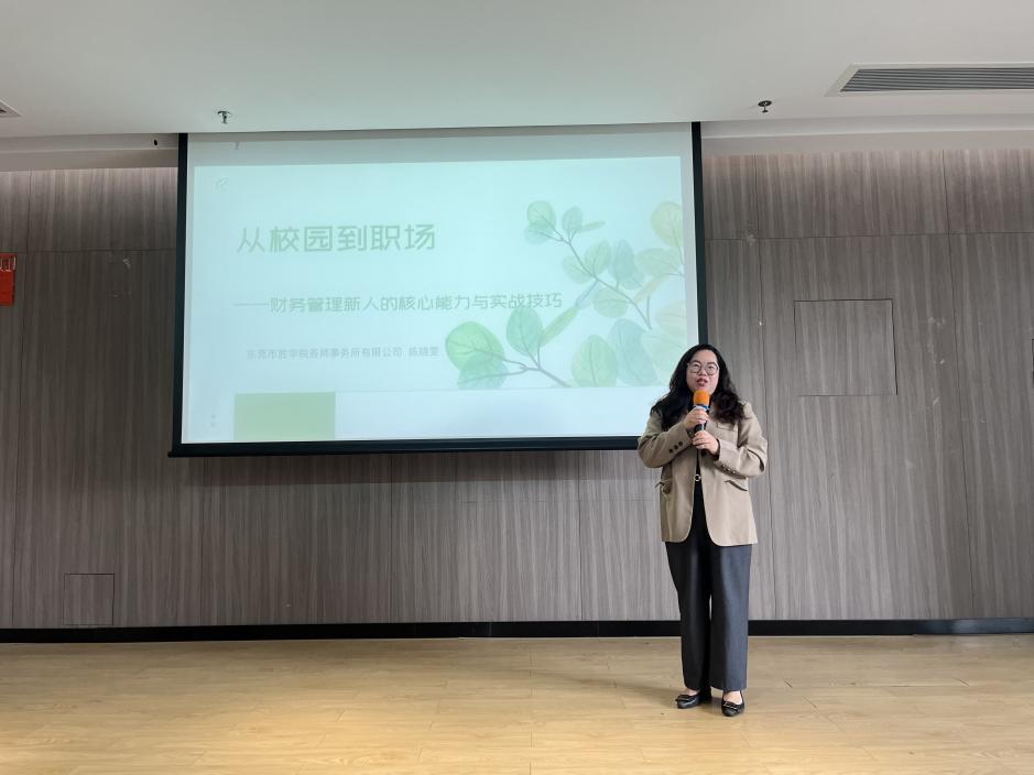 胜华税务师事务所总经理陈晓雯带来主题讲座《从校园到职场——财务管理新人的核心能力与实战技巧》,强调初级会计职称考证、专业课绩点提升的重要性,并呼吁学生提前规划职业路径,为职场竞争夯实基础。