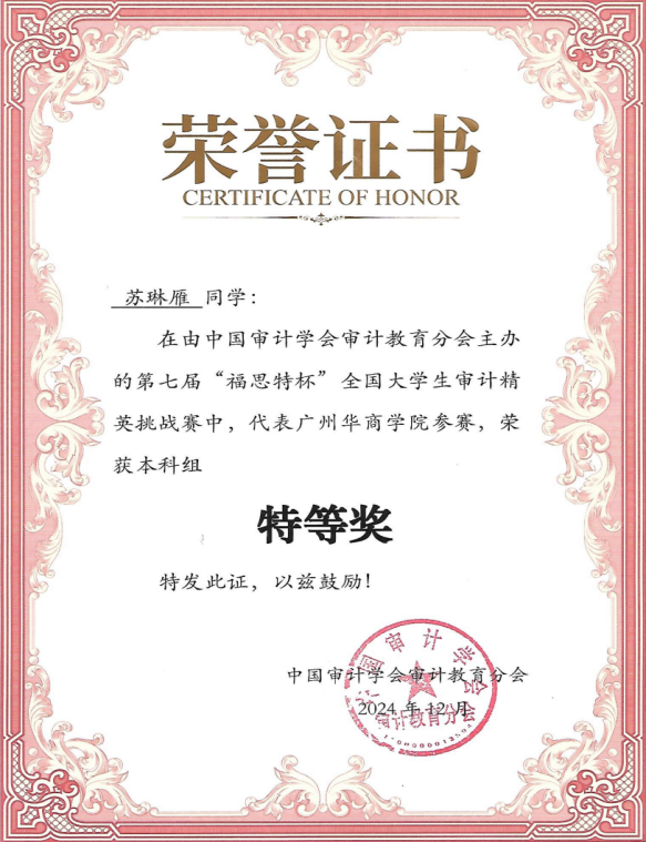 本专业学生在全国各类高水平审计专业竞赛中屡创佳绩,充分展现了卓越的专业素养和实践能力。近年来,学生团队先后在“福思特杯”全国大学生审计精英挑战赛总决赛中荣获特等奖,该赛事作为审计领域的权威竞赛,重点考察学生的审计实务操作、风险识别与应对等核心能力;在全国大学生智能审计技能竞赛中获得一等奖,充分彰显了本专业在智能审计技术应用方面的教学优势。
