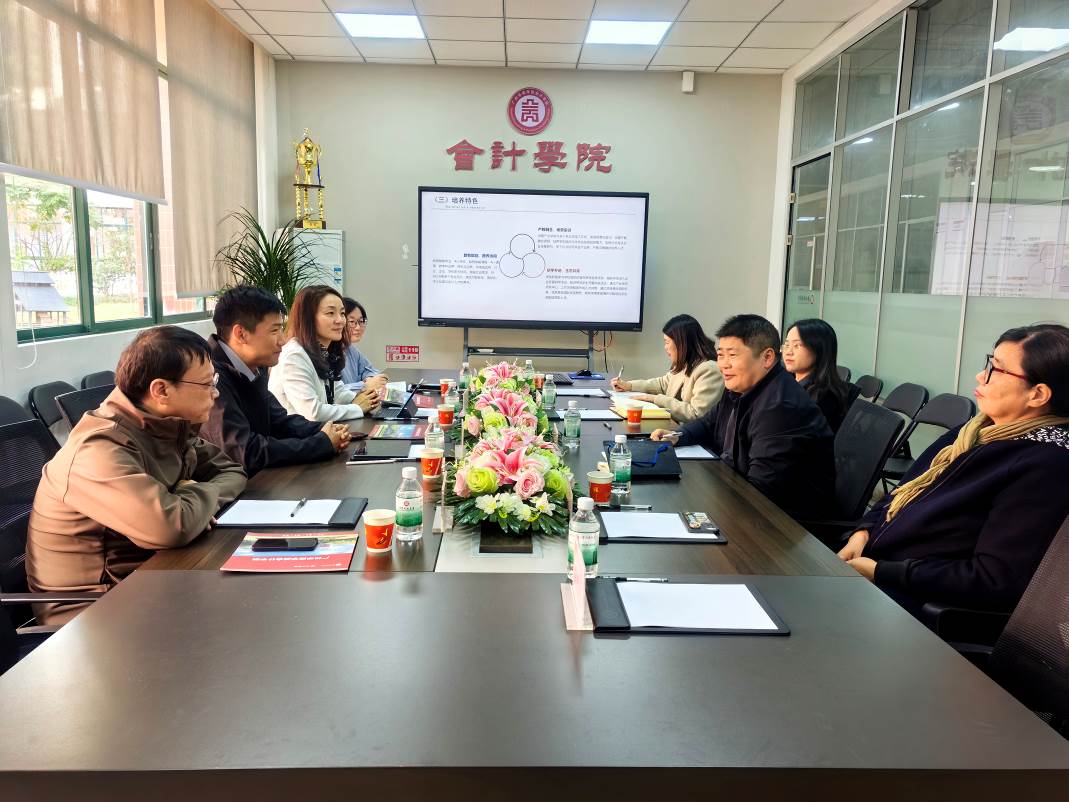 交流会伊始,副院长周书域对徐立文常务副院长一行的到来表示热烈欢迎,随后他从办学历史、学科建设、专业建设、课程建设、实验与实践教学体系建设、师资队伍建设、产教融合、办学特色等方面介绍了学院的基本情况。院长助理陈蒙梦重点介绍了学院国际化办学特色、办学成果及数智会计与商务服务产业学院赋能学院产教融合工作。beat365在线体育官网登录入口主任唐丽华介绍了会计学专业建设,突出“产教融合+课程思政”,通过课程建设推进五融合,打造了“校内实训平台+实验室+校外实践基地”的三级实验实习体系,让学生在学中做,做中学。财务系主任姚永红则从实验班及特色班建设、鼓励学生考证等方面介绍了财务管理专业的建设经验。