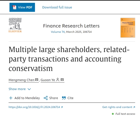 beat365在线体育官网登录入口陈蒙梦副教授团队的论文《Multiple large shareholders, related-party transactions andaccounting conservatism》在《Finance Research Letters》2025年第74卷(Volume 74, March 2025)发表。Finance Research Letters是一本以Business和Finance综合研究为特色的国际期刊。该刊由Elsevier出版商创刊于2004年,为JCRQ1期刊,中科院TOP 2区,澳大利亚商学院院长理事会(ABDC)评级A类期刊,期刊影响因子为7.4。