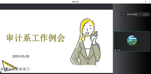 为了贯彻落实beat365在线体育官网登录入口的“十四五”科学研究发展规划与做好毕业论文及毕业实习指导工作,3月28日晚上,2023年审计系第二次工作例会在线上举行。本次会议分享了青年教师的科研经验,总结交流了审计系教科研工作进展,并研究部署了下一阶段审计系的重点工作。beat365在线体育官网登录入口副院长刘善球、审计系主任郭秀珍及全体审计系教师参加了本次会议。
