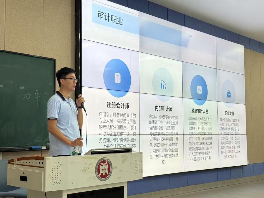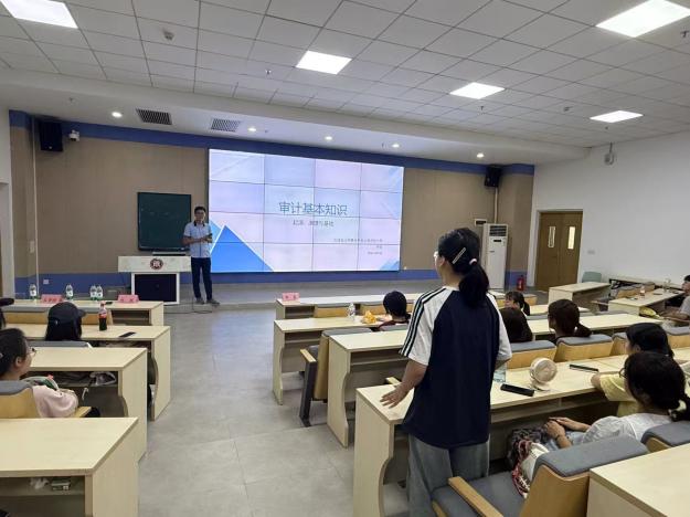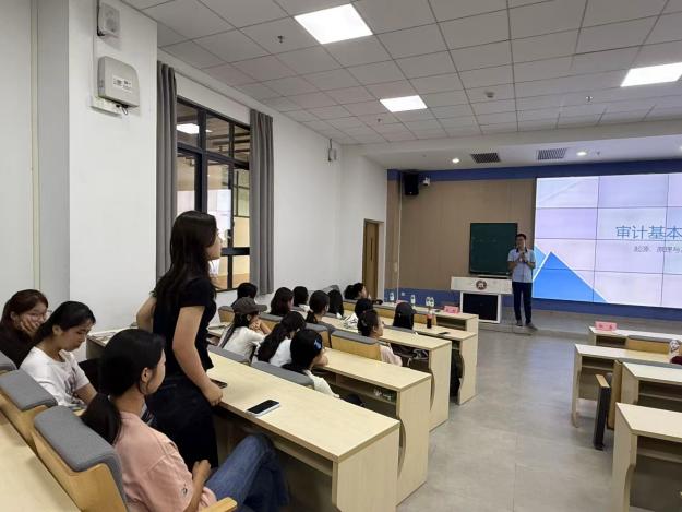林杭经理率先登台,开启了审计知识的深度讲解。他从审计的起源切入,以生动的互动开场,询问同学们对审计的初印象。面对同学们“审计是整理会计材料”“审计是检查会计账目的对错”等回答,林杭经理予以肯定并进一步拓展。他追溯审计的历史源头,详细阐述审计从古代萌芽到现代发展的历程,尤其着重强调现代信息技术对审计行业带来的变革性影响,为同学们展现出一个充满机遇与挑战的审计未来,鼓励同学们积极投身于信息技术与审计专业融合的探索中。此外,林杭经理还向同学们介绍了政府审计、内部审计,为同学们勾勒出多元的职业发展路径。