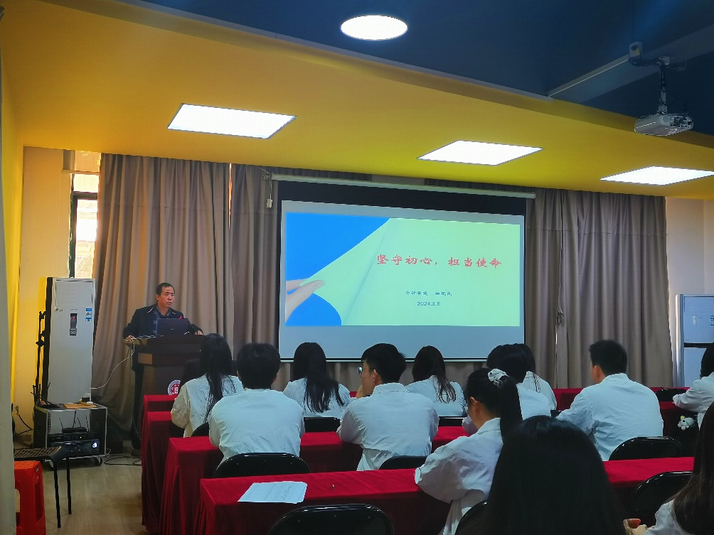 为坚持用习近平新时代中国特色社会主义思想铸魂育人,教育引导学生不忘初心、牢记使命,树立正确的世界观、人生观、价值观,2024年3月8日下午,beat365在线体育官网登录入口党委组织21级党员、入党积极分子及学生代表在beat365在线体育官网登录入口学术报告厅开展以《坚守初心,担当使命》为主题的思政第一课。本次授课主讲人为beat365在线体育官网登录入口院长姚凤民教授,讲座由beat365在线体育官网登录入口学工办副主任杨烨瀚老师主持。