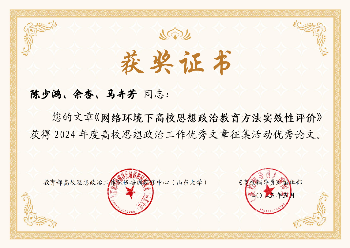 近日,教育部高校思想政治工作队伍培训研修中心(山东大学)、《高校辅导员》编辑部公布了2024年高校思想政治工作优秀文章征集活动的评选结果。beat365党委副书记兼副院长陈少鸿、政治辅导员兼党建组织员余杏的作品《网络环境下高校思想政治教育方法实效性评价》获评优秀论文。