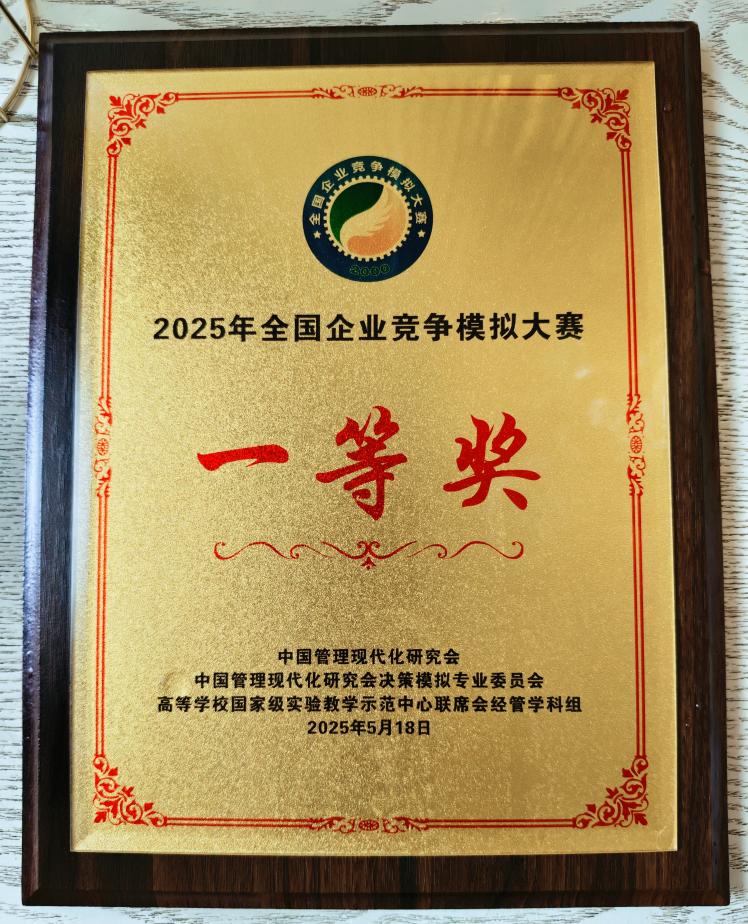 2025年5月18日,由中国管理现代化研究会决策模拟专业委员会主办、西南财经大学承办的2025年全国企业竞争模拟大赛总决赛落幕。我校学生团队在“数智沙盘赛道”中斩获全国一等奖。在郭美娣、何子昉老师指导下,由黎锡杰、杨建东、刘健荣组成的“奸商”队,从354所学校1619支队伍中突围,以3.9%的晋级比例跻身64强总决赛队伍,最终摘得桂冠,获得赛道一等奖和赛区第一的优秀成绩。
