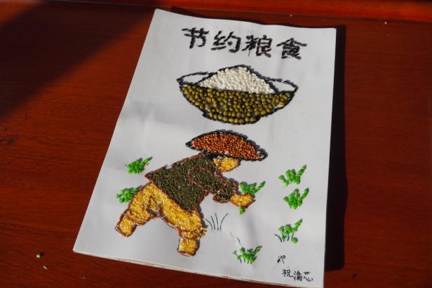 粒米之中藏乾坤,孩子们听着“一粟一饭,心系家国”的讲述,边将种子仔细粘贴,五彩谷物在掌心流转:有的在画中勾勒出金黄的田野,在其中嵌入鲜红的五角星;有的用不同谷物拼出祖国版图轮廓,颜色各异的种子如斑斓星火,栖满在这片承载着希望的土地。当遇难题时相互帮助,协作精神悄然萌芽。每幅作品,不仅有对节约粮食的领悟,更藏着孩子们对土地的热爱、对家国的赤诚——颗颗种子粘起的,是对劳动的尊重,更是对“爱党爱国”最纯真的诠释。