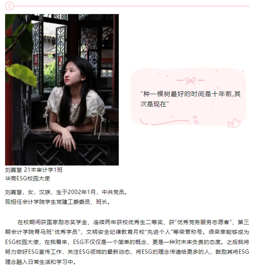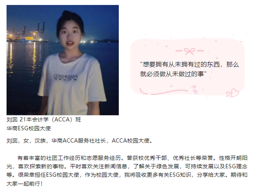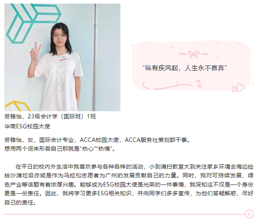 随着ESG行业的蓬勃发展与各项制度的逐步落实,在标准编制、理念推广、信息披露等方面将面临大量的ESG专业人才缺口。华商教育集团、华商beat365在线体育官网登录入口高度重视ESG人才培养。为进一步推进ESG人才培养各项工作开展,举办了第一届beat365在线体育官网登录入口ESG校园推广大使评选活动。随着校园大使评选落下帷幕,来自beat365在线体育官网登录入口的刘佳慧、刘蕊同学,国际学院的劳雅怡同学脱颖而出。在接下来的活动中,他们将承担各项工作任务,一展风采。