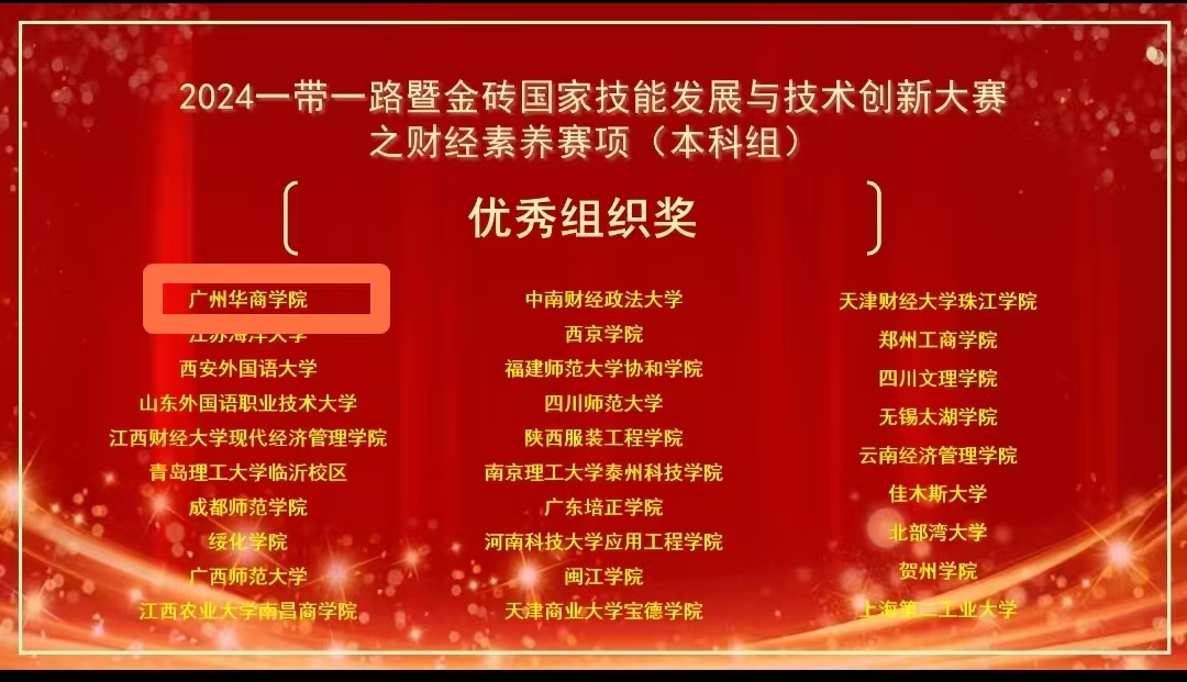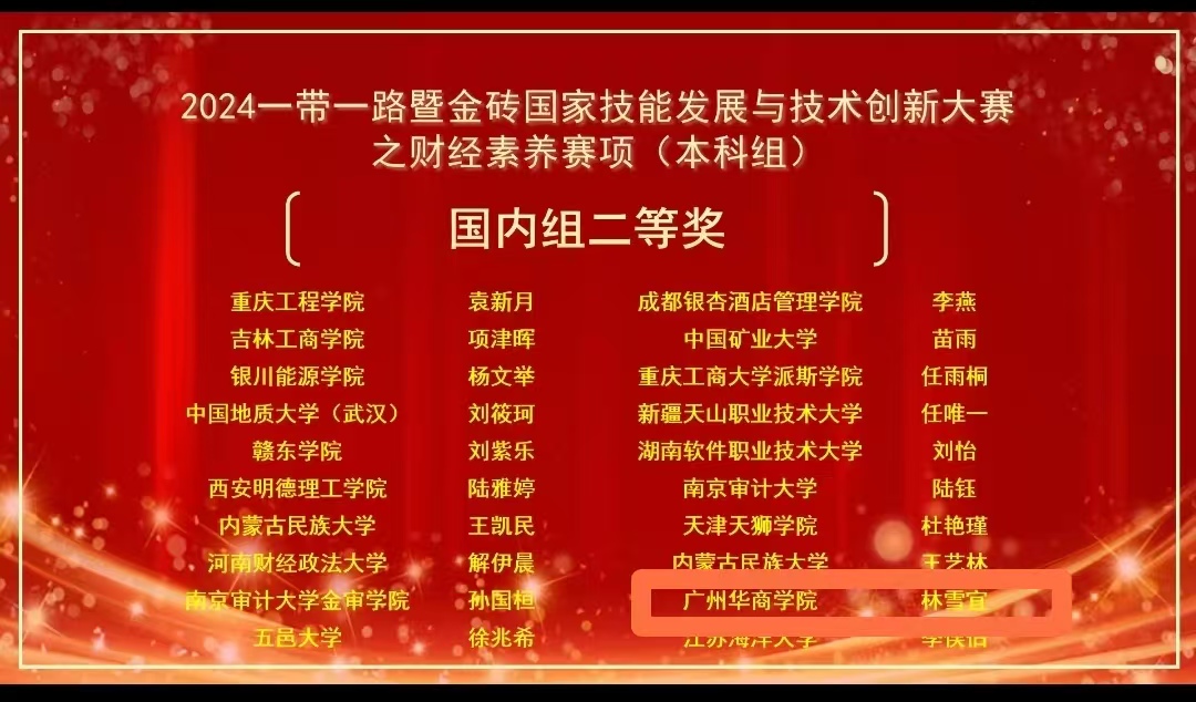 11月24日,由金砖国家工商理事会中方理事会、一带一路暨金砖国家技能发展国际联盟、中国科协“一带一路”暨金砖国家技能发展与技术创新培训中心主办的“2024一带一路暨金砖国家技能发展与技术创新大赛之第二届财经素养赛项”(本科组)全国决赛圆满落幕。来自上海财经大学、南京师范大学、首都经济贸易大学、闽南师范大学、新疆天山职业技术大学等全国206所高校的400多名学生参加了决赛。华商beat365在线体育官网登录入口两名会计学专业学生代表学校两支队伍在全国206所院校参赛队伍中脱颖而出,取得国内组二等奖和优秀奖。beat365在线体育官网登录入口荣获“优秀组织奖”。其中郭美娣老师、何子昉老师指导的林雪宜同学获大赛二等奖;陈顺意老师、罗永桂老师指导的陈诗雨同学获得优秀奖。