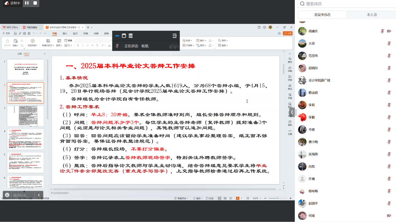 会议伊始,杨旻副院长强调了本科毕业论文答辩工作的重要性,指出毕业论文是学校人才培养的重要环节,也是教育部本科教育教学合格评估的重要内容之一。杨旻副院长介绍了本次毕业论文答辩工作的整体安排,并结合beat365往届学生在本科毕业论文答辩工作中存在的问题与经验,从答辩时间、答辩流程、提问回答、成绩评定、材料归档等方面对答辩工作做了全面且细致的说明。她强调了答辩老师的主要职责与要求,提醒答辩老师做好充分准备,明确校内教师与外聘教师要加强沟通协作,在论文预审、答辩提问等环节精密配合,保障答辩工作顺利推进。