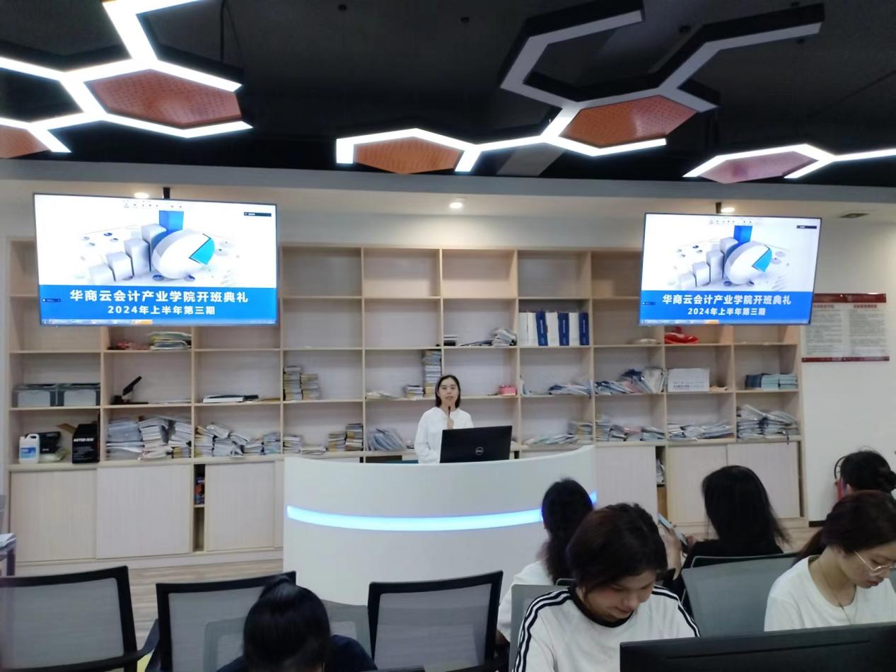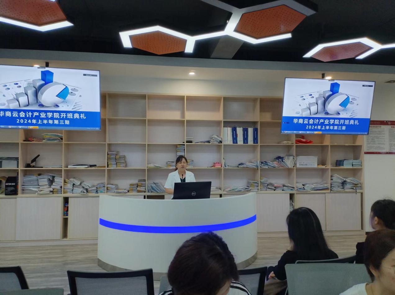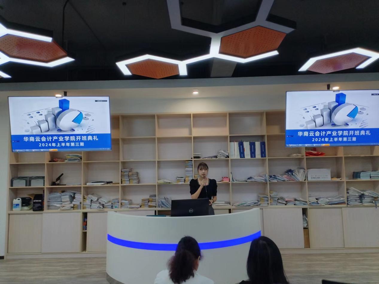 2024年4月22日上午,华商云会计产业学院联合正誉股份、融智•财务云共享服务中心、正保远程教育集团举办的“2023-2024学年第二学期第三期课程开班仪式”顺利进行。beat365在线体育官网登录入口副院长杨旻教授、产业学院副院长范卫星老师、产业学院石晟瑛老师、湛秀枝老师,共享中心企业谢云翠老师以及第三期学生参加了此次开班仪式。