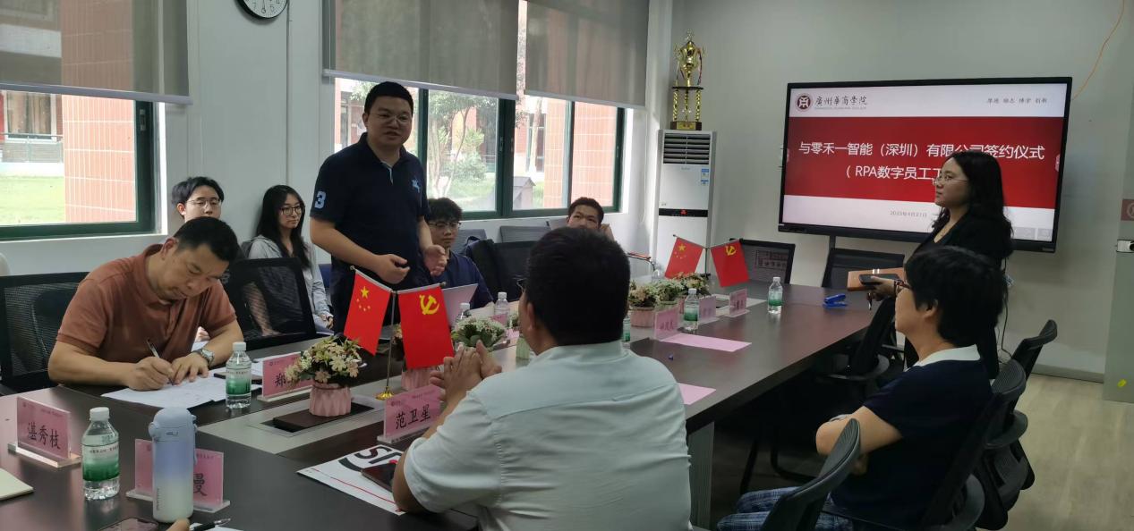签约仪式落成后,陈蒙梦老师以结果为导向,围绕人才培养合作与零禾一智能(深圳)有限公司总经理杨振展开深度探讨。陈老师提出:“希望企业可以切实带学生做项目,指导学生参与创新创业比赛、互联网+大赛等,让我们的学生有机会参访数字化企业,给学生视觉上的冲击,以吸引更多学生加入到数字员工工作坊。”