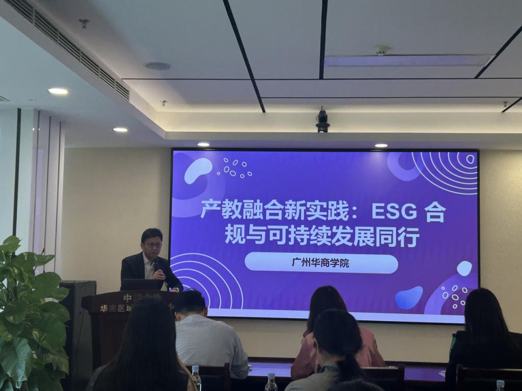 在分享环节,华商科教集团高级财务总监、数智会计与商务服务产业学院企业方副院长黄晓刚以“产教融合新实践:ESG合规与可持续发展同行”为主题,向与会嘉宾全面展示了华商的探索与成果。