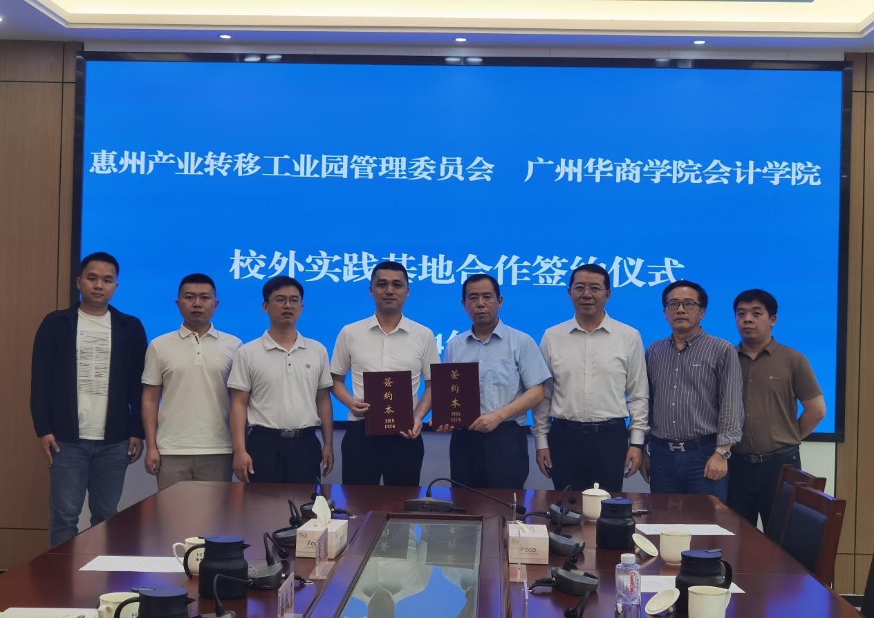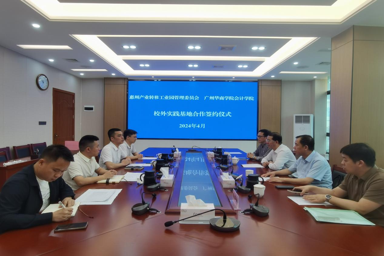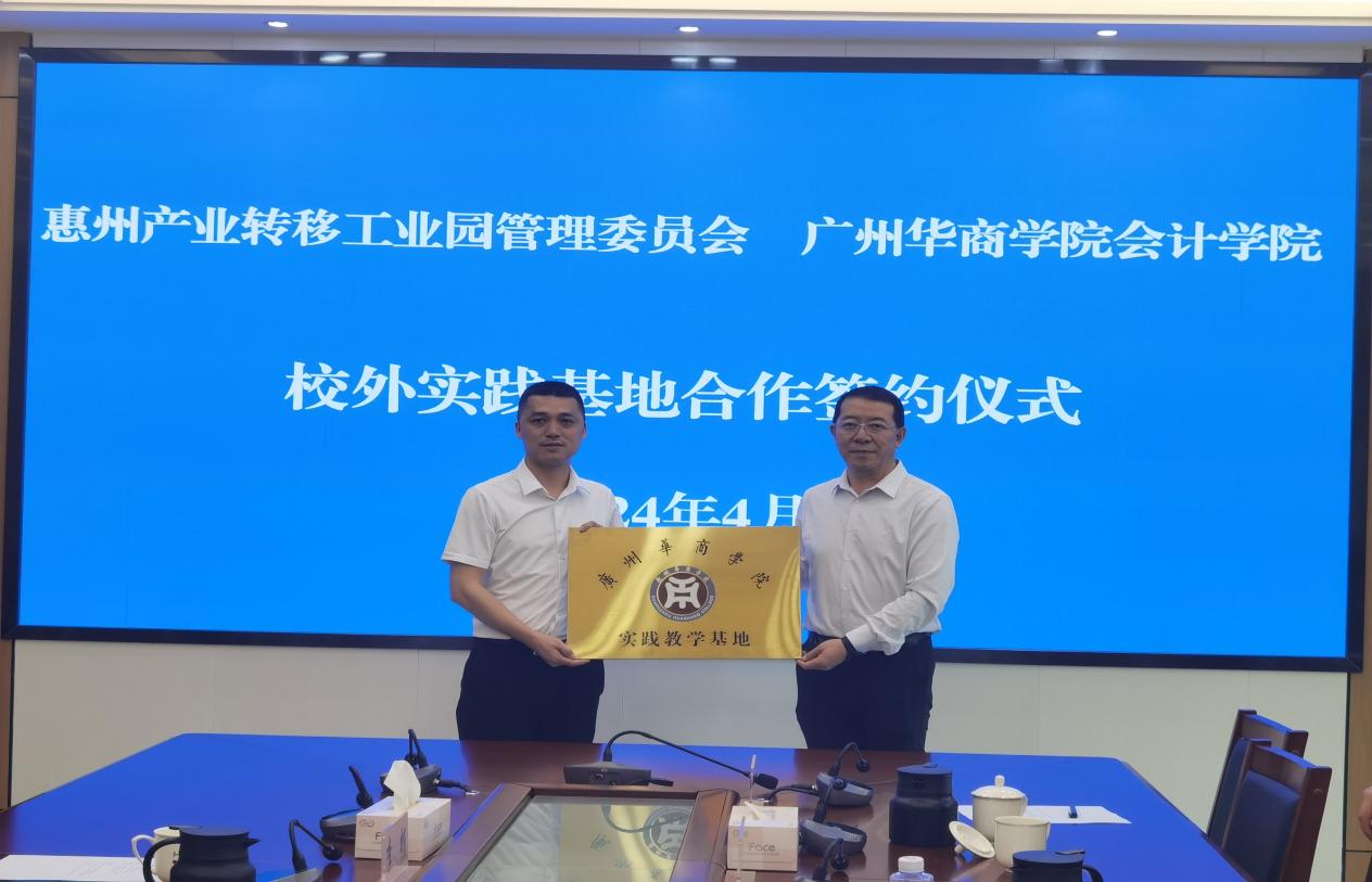 参访企业结束后,双方在工业园管理委员会会议室开展交流座谈并签署实习基地协议。座谈会上,吕峻闽副校长做了总结讲话,一是要相互增进彼此了解,讲好华商故事和园区故事,专业园区对接学校专业学院,加强校企合作。二是在人才培养方面需要学校各专业与企业加强沟通,把岗位、职业、知识需求等嵌入课程中,加强与园区企业联系,推动学生实习与就业。三是加强横向合作,在教师团队培养、双师型教师培育,特别是年轻教师进企业锻炼方面加强合作;另一方面,企业就前沿问题或攻关项目可与学校学院组队共同研究,学校提供最优质的服务与最优质的团队。四是要结合“三下乡”和“百千万工程”,让学生走向社会、走向企业,华商学院有众多学子可参与园区的公益活动。五是邀请园区领导带队莅临华商,开展调研、宣讲和讲座等活动,为华商传经送宝。姚凤民院长从为工业园提供服务,开展财务会计的公益讲座等方面提出实践基地发展的期望。姚凤民院长和谢帆宇副主任代表校企双方签署了《beat365在线体育官网登录入口校外实践基地合作协议书》。吕峻闽副校长为惠州产业转移工业园管理委员会授予“beat365在线体育官网登录入口实践教学基地”牌匾。