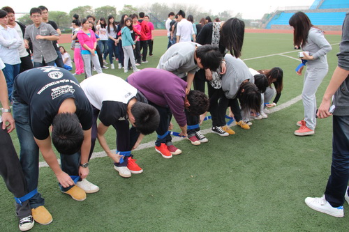 第三场——“多人多足”趣味赛紧接而来。 “多人多足”要求每组队员全员参加,左右两个同学脚和脚互相绑在一起,哪组最先到达50米外的终点为之胜利。这个游戏必须要齐心协办,才能获得成功。这是一项考验团队默契跟协调性的运动,最后,由第8小组以12秒成绩勇夺第一。