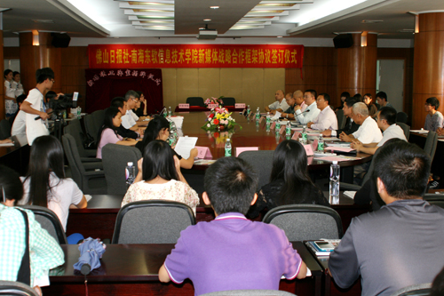 杨利、成侃、赵宇辰等院领导,以及有关系部负责人、师生近50人,与佛山传媒集团总编辑兼佛山日报总编辑宋卫东、佛山日报社总编辑助理兼融媒发展中心主任王伟、佛山日报社融媒发展中心副主任黎仁刚、佛山日报社多位编辑一同见证协议的签订。签订仪式由赵宇辰副院长主持,他从多个方面阐释了合作双方的合作基础以及合作的广阔发展前景。