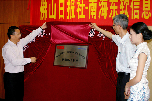签字仪式结束后,杨利与宋卫东一同为“佛山日报社•广东东软信息技术学院新媒体工作室”揭牌,成侃副院长向佛山日报社融媒发展中心授“广东东软信息技术学院产学研基地”牌匾。