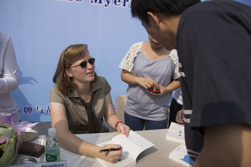 上午10点整,以“十年关注,情牵东软”为主题的院长杨利博士《关注》签赠仪式、英语系主任Julie Myer新书《十年》签售仪式同时在AB教学楼中间举行。签售场内座无虚席,场外的队排得很长。在主持人张奕老师的介绍下,院长杨利博士与系主任Julie Myer一起向大家挥手致意,同学们用热烈的掌声传递着祝愿与热情。