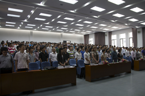 大会开始,全体师生起立,唱国歌。
