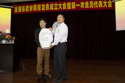 2006级校友郭伟涵向母校捐赠了骨瓷材质的花瓶,花瓶上绘有D座教学楼图案以及文字“十年创新育人路 两万精英在征途”。
