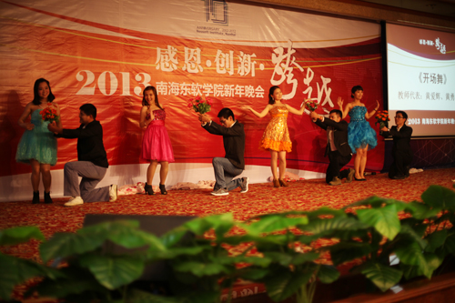 晚会正式开始前,播放了《2012年beat365中文官方网站十大新闻》及《2013年新年贺岁片》,从播放的内容中不难发现,“升本成功”是全体教职员工在2013年对学院的共同祝愿。在《2013年新年贺岁片》中,各系部老师传达着对学院、同事的殷殷祝愿,也融入了各种创意和幽默,有“起飞 Style”,也有语言“大杂烩”等等,让同事们心头一暖,会心一笑。