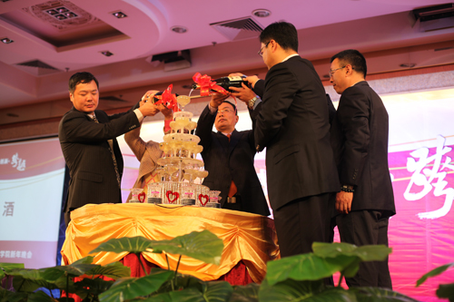 之后,杨利等院领导一同开启香槟,斟满酒杯塔,与全体教职员工举杯共庆新年。随后庆祝晚宴在歌曲《好日子》中开始。