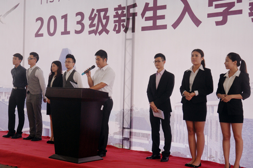 上午九时,由学工部部长孙赐星主持的新生入学教育在体育馆正式开始。首先,学院领导、全体中层干部与新生见面。院长杨利博士、党委书记左斌教授、副院长刘书生教授、刘春雨博士、陈万里博士,学院领导成侃、张瀚涛,党委副书记陆柳华,以及各系部负责人入场,向同学们鞠躬、挥手致意。同学们报以热烈的掌声。