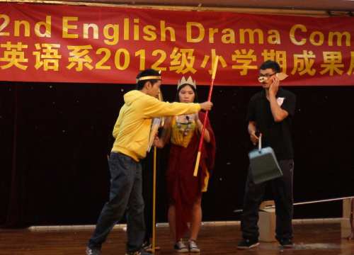 以“童话故事”为主题的英文戏剧表演吸引着同学们参与。由2012级6个班自导、自编、自演,近百名演员登台、上演的一出出精彩的英文短剧获得了师生的一致好评。同学们标准的发音,投入的表演无一不体现着同学对英语专业的喜爱,对国外文化的了解,对专业知识的应用。最后,12商英1班以创新的编剧、标准的发音、动情的演出获得第一名,12商英2班和12商英6班分别获得第二和第三名。英文戏剧表演比赛既是对同学们小学期学习成果的检验,同时也是对同学们专业水平的锻炼。