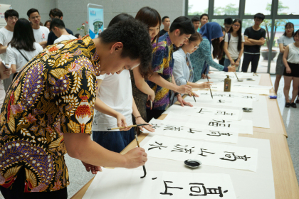 在活动现场,国际合作部的7位外国留学生与书法社、现场观众一起进行了书法创作表演,赢得了现场一片赞声。