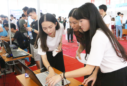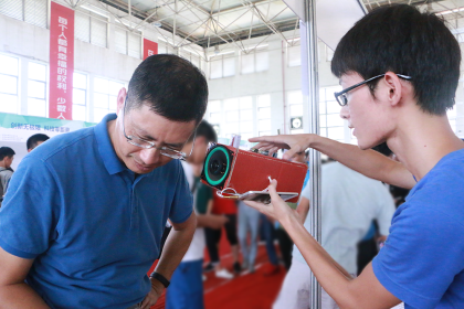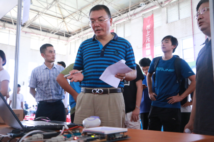 “我们开发的这个坦克大战,是可以自己设计地图进行游戏的,帅不帅?”、“这是我们自己做的一款旅游的APP,可以线上聊天,还可以组团出游,符合我们学生省钱的方针!”、“现在你看,小车运动的轨迹是通过我手势的变换来实现的。”……9月27日下午,体育馆里人潮涌动,各种自带科技范的摊位上,展示各种各样的“产品”,有游戏、网站、APP、遥控小车、播放器、炒股神器等等,熙来攘往的人群穿梭其间,其中还不乏学院领导,场面热闹非凡。