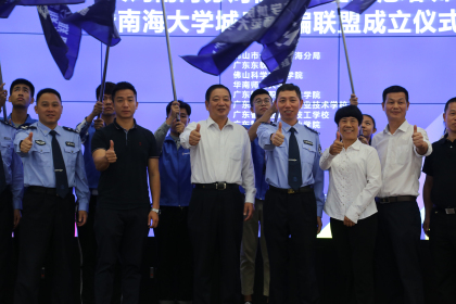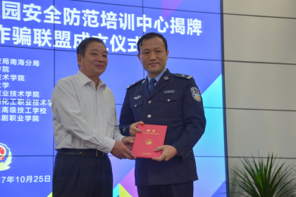 10月25日,佛山市公安局南海分局校园安全防范培训中心揭牌暨南海大学城反诈骗联盟成立仪式在我院F218举行,佛山市南海公安分局副局长李坚强、我院党委书记左斌出席了本次活动并致辞,佛山科学技术学院、华南师范大学、广东轻工职业技术学院、广东省石油化工职业技术学校、广东省工业高级技工学校、广东舞蹈戏剧职业学院的领导和媒体代表、学生代表近400人参加了此次活动。培训中心和联盟成立后,将通过警、校联合开设选修课、主题宣传进校园、基地参观、互动体验等形式,向南海区七所高校的学生普及安全防范知识。我院成为了第一个受益者。