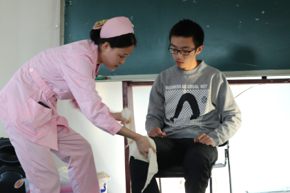 “初级创伤应该如何包扎处理?”现场的护士表示,根据受伤位置的不同,分为很多种方法,随即现场演示了最常见的手部以及膝关节的包扎方法,并邀请同学们亲身体验。