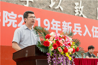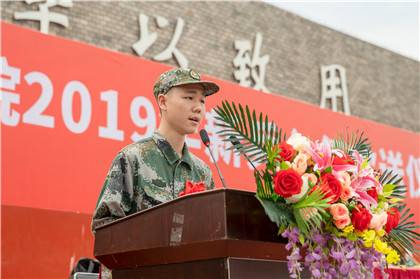 2019年入伍新兵代表陈宇代表全体入伍大学生发言,表达了对学校培养的感恩之情、在部队艰苦奋斗的决心以及对全体军训学生的寄望。王佩玲老师代表全校老师,对入伍新兵提出三点希望,希望他们牢记使命,牢记军人的基本要求,牢记学校、家长、老师的嘱托。罗森明组长重点介绍了国家对退伍军人的各项优待政策。
