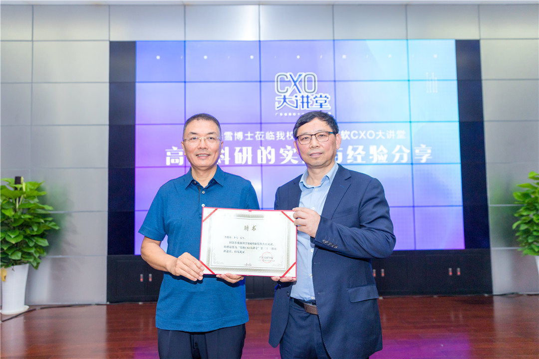 会后,校长杨利博士为李雪博士颁发了CXO大讲堂的嘉宾聘书。东软CXO大讲堂是知识的殿堂,思想的盛宴,是各路大师与当代青年对话的桥梁。迄今为止,已经成功举办了33期,邀请的嘉宾包括国内外知名学者、企业高管、政府官员等等。被共青团广东省委、广东省教育厅、广东省文化厅和广东省学联授予“广东高校十大文化品牌”称号。